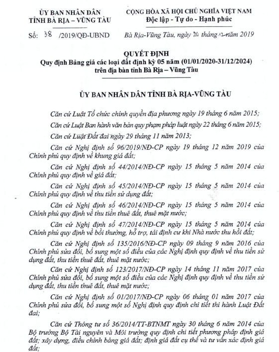 Bảng giá đất trên địa bàn tỉnh Bà Rịa Vũng Tàu giai đoạn 2020-2024